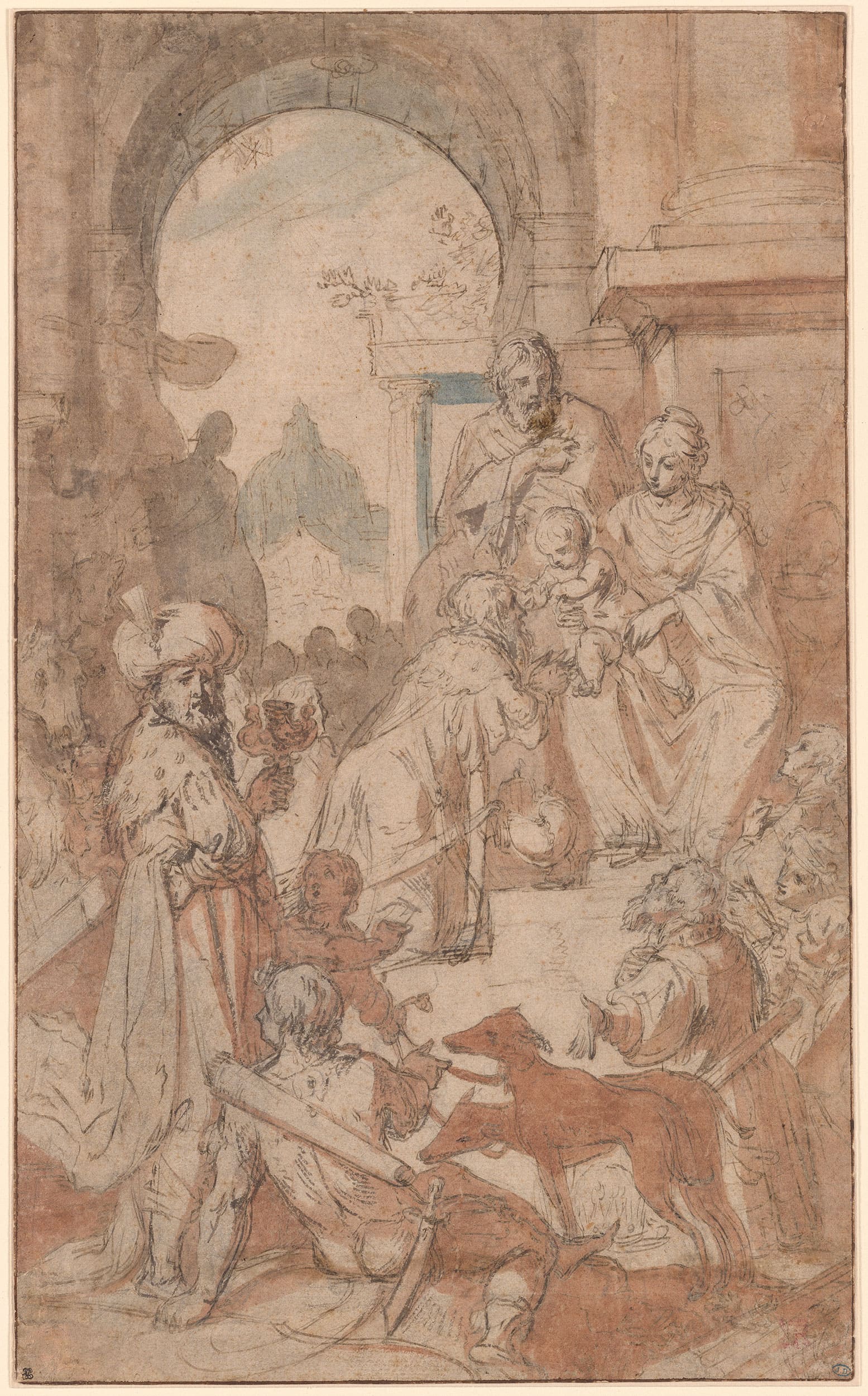 Claude Vignon, to whom this sheet was attributed, was one of many artists who produced painted versions of the Adoration of the Magi in the 1620s-50s. Works by French, Flemish and Italian artists feature variations on this popular composition utilizing many of the same elements. What distinguishes this design is its exaggerated vertical format, its architectural (rather than rural) setting (lacking any suggestions of a lean-to or ruins housing the Holy Family), that only two of the three kings are noticeably depicted (and that the artist eschewed representing a Black king), and the inclusion of an elegantly posed roman soldier in the foreground who reclines alongside two dogs on a leash held by a boy accompanying the king. This arrangement of the figures in an open oval configuration and the strong diagonal of the composition are not common features of the many Adoration scenes from this period. The architecture, and view of a domed church in the distance, points more to an Italian author, or to a French artist working in Italy. The use of red chalk wash and blue watercolor is another distinctive feature and one that sets it apart from Vignon's oeuvre.