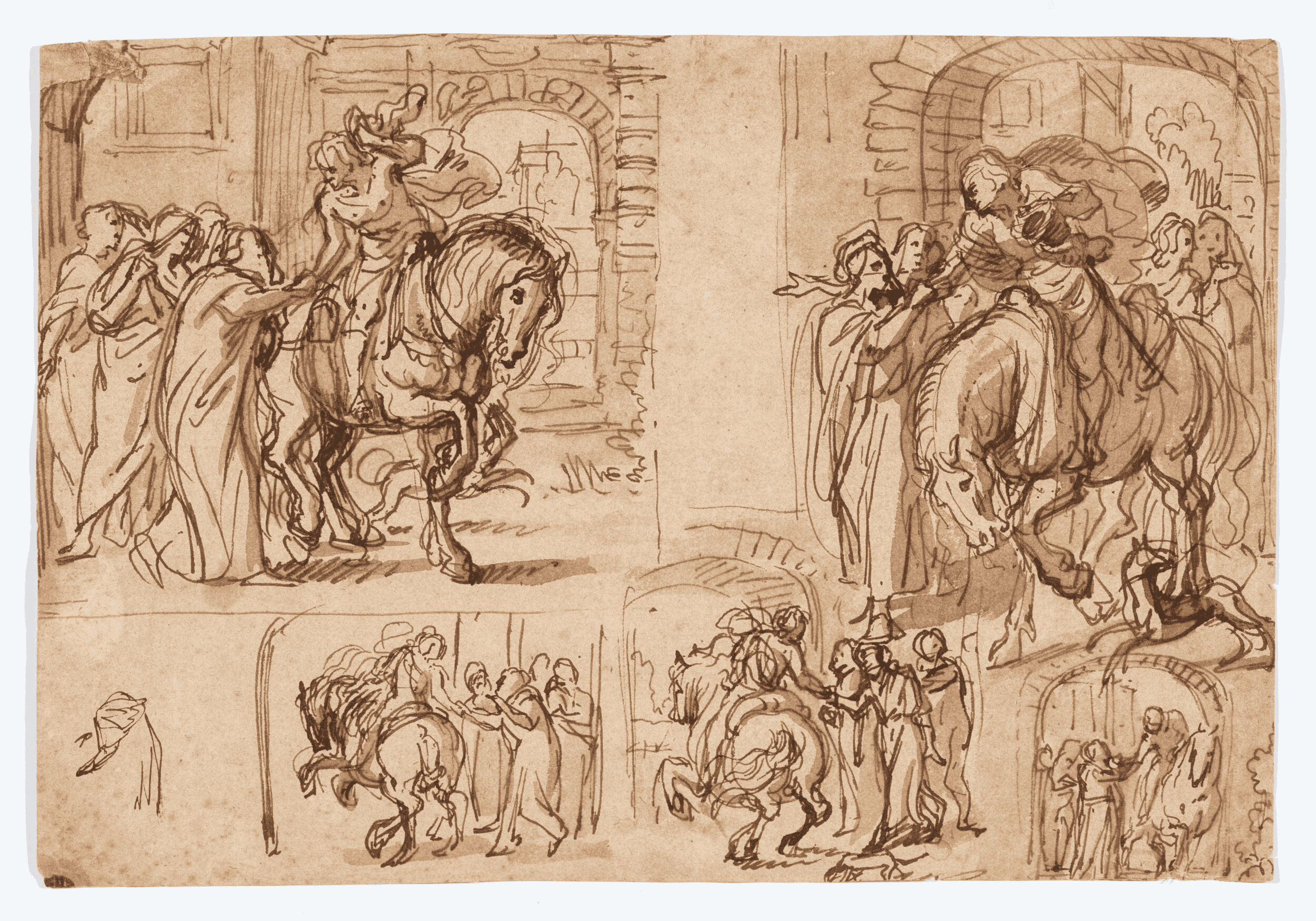 This drawing was purchased by Robert Witt in 1952 as ‘Italian? Or Flemish school’. Frits Lugt suggested it could be by H. (Hieronymus?) Francken. An inscription in Witt’s hand on the verso of the sheet implies he thought it could be by Luca Cambiaso, while in Spain. The drawing had been missing since 2001 and was only recovered in 2023; recent in-person examination has raised questions about whether the drawing is Italian or Flemish, and any possible attributions. Theodoor van Thulden has been suggested but with no strong comparisons found. Pietro Sorri has also been suggested, but with no similar drawings by him known.