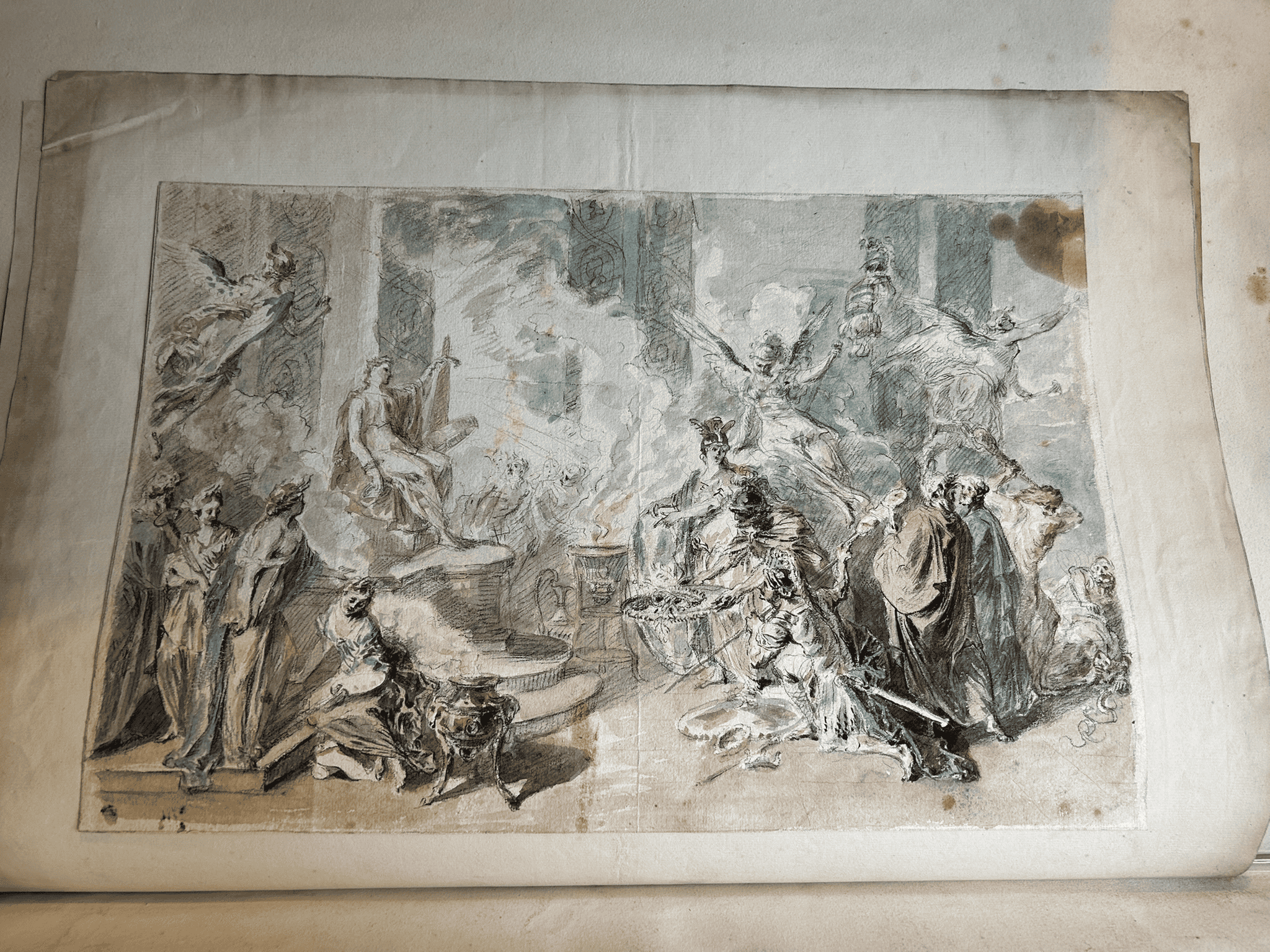 This newly discovered drawing is a puzzling both regarding its attribution and its subject. For the former, it has been suggested French, Genoese and Flemish. The technique of chalk and coloured wash (with no pen) is distinctive, so it may invite a name. The subject is also confusing; in the middle with shield and helmet, we might see Athena (but Bellona has also been suggested). It is difficult to distinguish what the man next to her is offering to the figure on the throne. The Arts/Muses are on the left, and presumably Hercules and Fame driving out Envy.